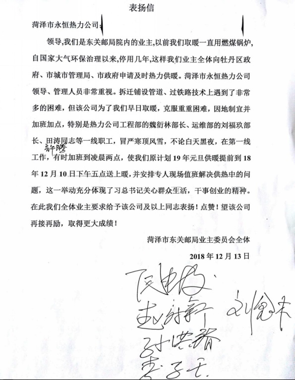 12月13日,永恒熱力辦公室收到了來自雙河路郵政局家屬院業主委員會的表揚信。感謝永恒熱力工程部和運行管理五部盡心盡力為其解決供暖問題。