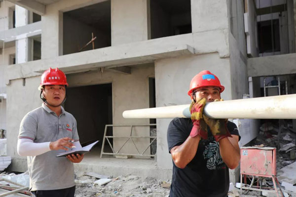 在天潤府小區施工現場,畢敬賢正在督導施工人員安裝小區單元立管,在弱電井不足1平方米的空間里,陰暗、潮濕、悶熱,畢敬賢和工人師傅們額頭上汗珠不停滾落。雖然小區的二級熱網建設通常都集中在酷暑夏季,但這從不影響熱力人工作的熱情。冬季忙供熱,夏季忙建設,默默無聞的堅守在崗位上,奮戰在一線,全力以赴保任務、促進度、搶工期,不叫一聲苦,不喊一聲累,以實際行動保障新小區如期用暖。
