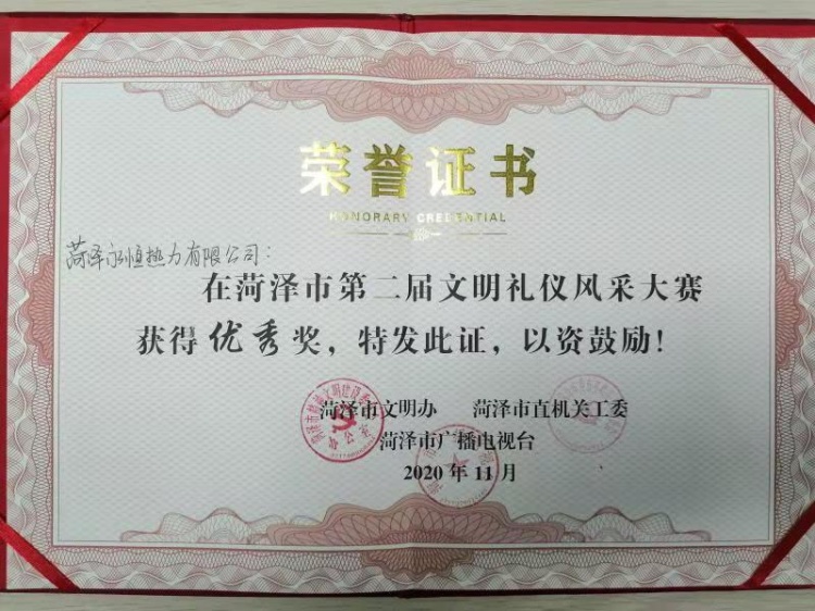 11月26日,由市文明辦、市直機關工委、市廣播電視臺舉辦的“菏澤市第二屆文明禮儀風采大賽頒獎典禮”在菏澤市廣播電視臺演播大廳舉行。菏澤永恒熱力有限公司榮獲菏澤市第二屆文明禮儀風采大賽優秀組織獎。