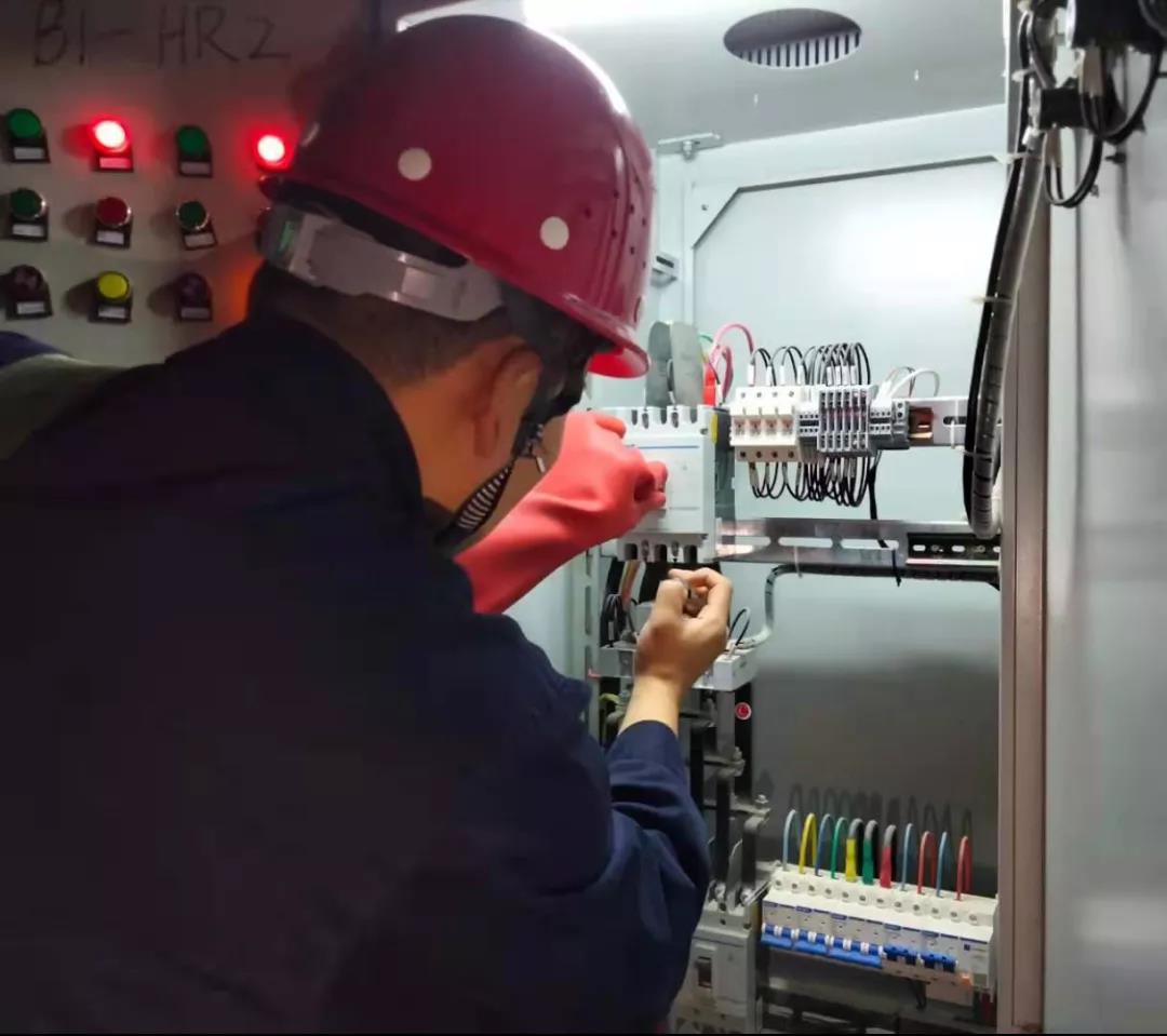 演練正式開始。按照事前部署,管理員趙飛在巡查換熱站時,打開換熱站門,發現地面有積水,排除自來水泄露原因,趙飛立刻判定是設備某處漏水。他快速穿戴好絕緣裝備,掏出工具包中的電筆,檢測地面和配電柜是否存在漏電隱患。隱患排除后,趙飛打開站內照明設備,機動組人員進入站內排查漏水原因。