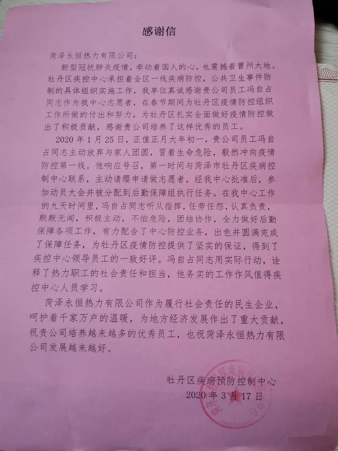 2020年初,疫情來(lái)襲,牽動(dòng)著國(guó)人的心,也深深牽動(dòng)永恒熱力運(yùn)營(yíng)管理二部管理員馮自占的心,一夜輾轉(zhuǎn)反側(cè)后,他第一時(shí)間與菏澤市牡丹區(qū)疾病控制中心取得聯(lián)系,主動(dòng)請(qǐng)纓申請(qǐng)做志愿者,經(jīng)批準(zhǔn),被分配到后勤保障組執(zhí)行任務(wù)。1月25日,正值正月大年初一,馮自占主動(dòng)放棄與家人團(tuán)圓,冒著生命危險(xiǎn),義無(wú)反顧沖向疫情防控第一線(xiàn)。“我不是醫(yī)生,不能再次奔赴前線(xiàn),救危難于生死,那我就多做些力所能及的事情”,事實(shí)上馮自占也是這么做的,他出色并圓滿(mǎn)完成了保障任務(wù),被牡丹區(qū)疾病預(yù)防控制中心授予了“新型冠狀病毒肺炎防控優(yōu)秀志愿者”稱(chēng)號(hào)。