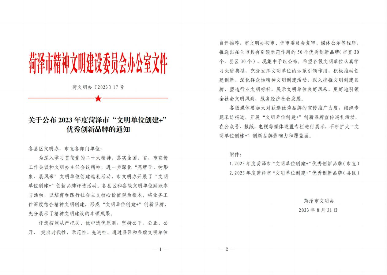 8月31日,菏澤市文明辦下發《關于公布2023年度菏澤市“文明單位創建+”優秀創新品牌的通知 》,菏澤永恒熱力有限公司“志愿永恒 服務民生”文明創建品牌榮獲2023年度菏澤市“文明單位創建+”優秀創新品牌。