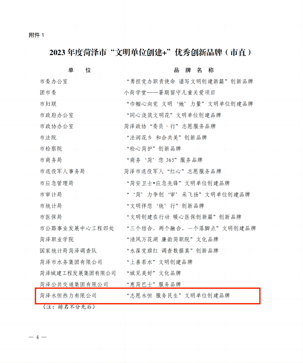 永恒熱力“志愿永恒 服務民生”文明創建品牌榮獲2023年度菏澤市“文明單位創建+”優秀創新品牌